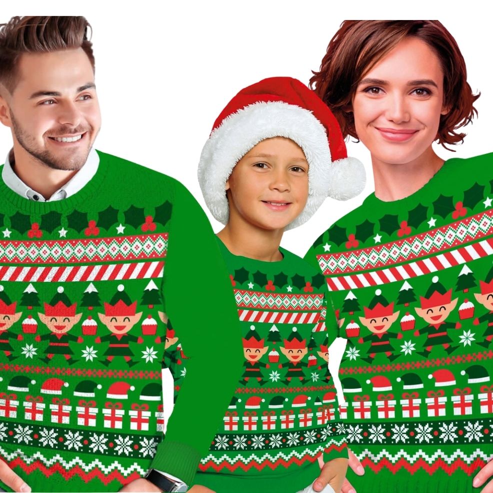 Sweater de Natal de Elfo para grupo para Carnaval e Festas Temáticas. Escolha os tamanhos e quantidades que você precisa e tenha sucesso com nossas melhores ideias para se vestir em grupo ou em família.